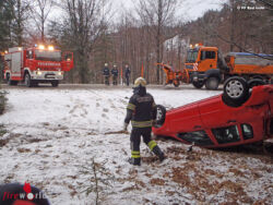 BAD ISCHL (OÖ): Um 7:15 Uhr des 1. März 2017 wurden die Kameraden der Freiwilligen Feuerwehr Mitterweißenbach zu Aufräumungsarbeiten nach einem Verkehrsunfall ins Weißenbachtal alarmiert. Zwei Personenkraftfahrzeuge kamen unabhängig von einander in derselben Kurve von der Fahrbahn ab. Ein Fahrzeug überschlug sich dabei und kam am Dach zum Liegen.