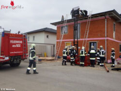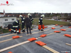 Aufgrund der kalten Temperaturen konnte die Dachfolie noch nicht vollflächig verklebt werden, sodass die Plane noch locker auf der Holzunterkonstruktion lag. Durch die starken Windböen bewegte sich die Plane stark und drohte sich zu lösen. Die Feuerwehr holte mit dem Löschfahrzeug und dem Gemeindelader die fertig gefüllten Sandsäcke aus dem Gemeindebauhof. Mit dem Feuerwehrstapler wurden Holzbretter und Sandsäcke auf das Pultdach gehoben. Anschließend wurden die Holzbretter am Dach aufgeteilt und mit Sandsäcken beschwert.