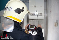 Unter Atemschutz und mit einem Mehrgasmessgerät ausgestattet wurde die Erkundung im Wohnhaus durchgeführt. Die Feuerwehr Wiener Neustadt kontrollierte alle Wohneinheiten und evakuierte das Haus. Dabei stellte man in der betroffenen Wohnung über 190 ppm Kohlenstoffmonoxid-Konzentration fest, obwohl bereits gelüftet war. Die maximale Arbeitsplatzkonzentration liegt bei 30 ppm. In weiterer Folge mussten drei Türen zu Wohnungen aufgebrochen werden, um sicher zu gehen, dass niemand betroffen ist.