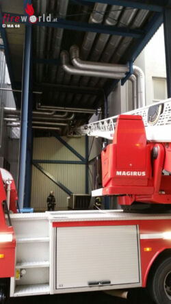 WIEN. 11. BEZIRK: Vermutlich aufgrund eines technischen Gebrechens in einer Halle geriet gegen 14.45 Uhr des 7. März 2017 das Dach eines Gebäudes auf dem Kraftwerksareal in Brand. Die ersten Löscharbeiten in etwa 10 Meter Höhe wurden von der Betriebsfeuerwehr begonnen.