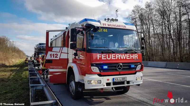 WEINGARTEN (DEUTSCHLAND): Um 9.13 Uhr wurden die Feuerwehr Weingarten und die Berufsfeuerwehr Karlsruhe am 10. März 2017 zu einem Lkw-Brand auf der Bundesautobahn 5 in Richtung Süden alarmiert. Beim Kilometer 620 zwischen Weingarten und der Anschlussstelle Karlsruhe Nord hatte 67-jähriger Lkw-Fahrer aus Regensburg eine Rauchentwicklung an der Hinterachse seines Pkw Transporters bemerkt.