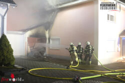 Die Bewohner hatten das Einfamilienhaus verlassen und die Nachbarn des Nachbarhauses gewarnt. Die Alarmstufe wurde auf Feuer 2 erhöht. Sofort wurden massive Löschmaßnahmen eingeleitet. Mehrere Trupps von Berufs- und Freiwilliger Feuerwehr nahmen unter Atemschutz zur Brandbekämpfung vier C-Rohre vor. Außerdem kam das Wenderohr der Drehleiter zum Einsatz. So konnte ein Übergreifen der Flammen auf das gesamte Wohnhaus und auf das Nachbarhaus verhindert werden. Hier war bereits die Rollade geschmolzen und von der Doppelverglasung des Fensters eine Scheibe geplatzt.