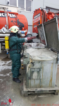 Der Tankwagen des Entsorgungsunternehmens wurde anschließend mittels HD-Rohr des TLFA4000 gereinigt, um eine weiterer Kontamination der Umwelt während der Fahrt zu verhindern. Nachdem der Tankwagen des Entsorgungsunternehmens den Vorplatz verlassen hatte, konnte der Kalk, welcher als Flusssperre verwendet wurde, ebenfalls entsorgt werden. Der Vorplatz wurde mittels HD-Rohr des TLFA4000 ebenfalls gereinigt. Bei dem Chemieunfall wurden keine anwesenden Personen verletzt.