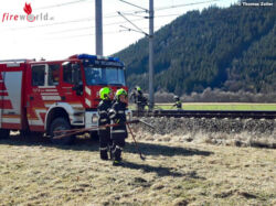 STEIERMARK: Rund 100 Mann aus zwei Bereichsfeuerwehrverbänden waren am 11. März 2016 bei einem Brand im Einsatz. Aus nicht weiter bekannter Ursache kam es gegen 13:45 Uhr zu einem Bahndammbrand zwischen St. Michael und Preg.
