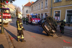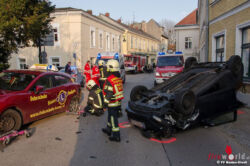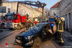 BADEN (NÖ): Zu einem spektakulären Verkehrsunfall kam es in den Sonntags Nachmittagsstunden den 12. März 2017 in Baden. Als die Einsatzkräfte der alarmierten Freiwilligen Feuerwehr Baden-Stadt am Einsatzort eintrafen, wurde eine verletzte Fahrzeuglenkerin von den ebenfalls alarmierten Rettungskräften bzw. vom Notarzt bereits erstversorgt.