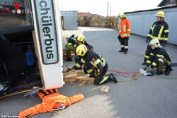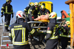 Diese drei Stationen wurden jeweils unter Anleitung eines Experten abgearbeitet, alternative Lösungsmöglichkeiten aufgezeigt und ausprobiert. Abschluss bildete dann eine Vorführung eines Teils der Mannschaft, wie man einen umgekippten Bus mit Gegensicherung ordnungsgemäß aufstellt. Ein Dank gilt allen, die zum Gelingen beigetragen haben. Neben den oben erwähnten Firmen sind dies die Unternehmen Mercedes Luger (Bereitstellung des Ausbildungsgeländes), Heuberger (Bereitstellung von zwei Bussen), Weyland und MAN (Bereitstellung LKW‘s) und Lo Motion.