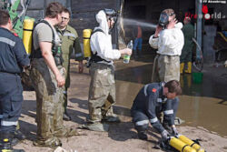 Zunächst wurde mittels Belüftungsgerät Frischluft in die Grube eingeblasen und gleichzeitig ein Gülletransporter mit Pumpe organisiert. Damit wurde zunächst der Flüssigkeitsstand soweit abgesenkt, dass ein inzwischen vorbereiteter Atemschutztrupp in die Güllegrube absteigen und sich um die Tiere kümmern konnte. Gemeinsam mit dem Traktor samt Hubvorrichtung des Betriebsinhabers konnte die Feuerwehr dann nach und nach Kalb für Kalb zur Öffnung leiten und aus der Grube heben.