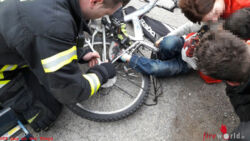 Unverzüglich begab sich das RLFA 2000 an die Einsatzörtlichkeit. Ein Kind kam aus unerklärlicher Ursache mit dem Fuß zwischen die Speichen des Hinterrades und dem Fahrradrahmen. Der Fuß des Kindes verkeilte sich derart, dass ein Herausziehen bzw. ein Einfaches befreien des Fußes nicht möglich war.
