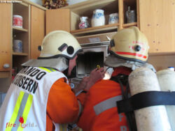 Vor Ort zeigte sich die Lage weniger dramatisch als die Alarmmeldung vermuten hatte lassen: Im ersten Obergeschoß war der Inhalt eines Mirowellenherds in Brand geraten, der Brand blieb jedoch auf das Gerät beschränkt. Seitens der Feuerwehr wurde das eingebaute Elektrogerät demontiert und ins Freie gebracht. Mittels Wärmebildkamera erfolgte noch eine Kontrolle auf eine mögliche Brandausbreitung. Danach konnten die Kräfte wieder einrücken, Gesamtmannschaft 40 Kräfte.