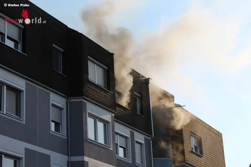 Bereits auf der Anfahrt waren dichte Rauchschwaden, die aus einer Wohnung im obersten Stockwerk drangen, ersichtlich. Nach Eintreffen und einer kurzen ersten Unterweisung durch den Einsatzleiter wurde umgehend die Drehleiter zur eventuellen Menschenrettung und in weiterer Folge der Brandbekämpfung in Stellung gebracht. Die eine vermisste Person konnte vom bereits im Brandobjekt befindlichen Atemschutztrupp der Feuerwehr Leitring rasch lokalisiert werden. Sie hatte in letzter Sekunde auf einen Balkon flüchten können und rettete sich vermutlich so das Leben.