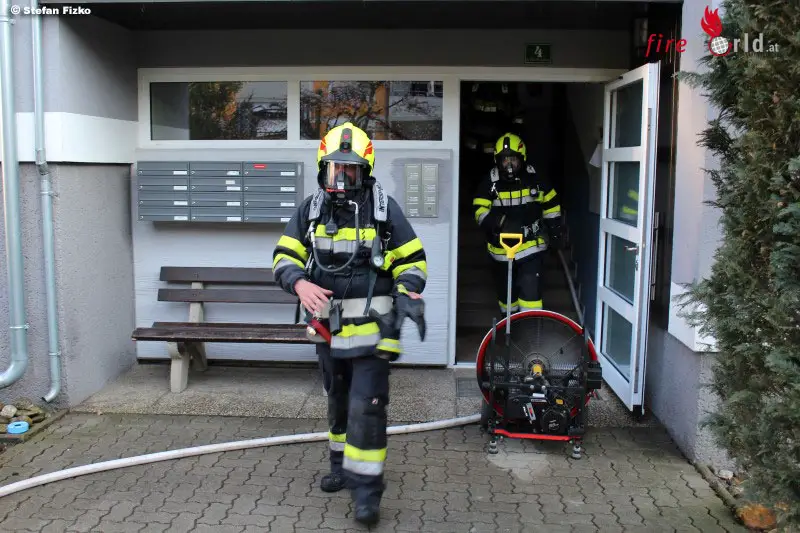 Über das Stiegenhaus wurde die Person dann endgültig gerettet und mit Verdacht auf eine Rauchgasvergiftung sowie zur weiteren Kontrolle ins Landeskrankenhaus Wagna eingeliefert. Da somit alle vermissten Personen in Sicherheit gebracht waren, begann ein Atemschutztrupp mit der Brandbekämpfung über die Drehleiter auf der Außenseite des Objektes. Zur gleichen Zeit bekämpfte ein weiterer Atemschutztrupp das Feuer von innen. Durch das rasche Eingreifen konnte ein weiteres Ausdehnen des von der Küche ausgehenden Brandes erfolgreich verhindert werden. Durch die starke Rauchentwicklung wurde die Wohnung