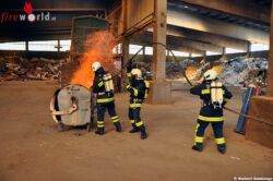 Im Aussenbereich wurde der Brand bei den Containern mittels Schaumangriff bekämpft. Am Gebäude selbst wurde an beiden Seiten ein massiver Löschangriff mit B-Strahlrohren durchgeführt. Und über das Hallendach von der Teleskopmastbühne aus das Feuer eingedämmt.