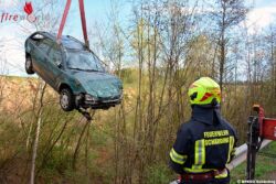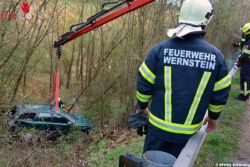 Mittels Kran wurde das Fahrzeug geborgen und auf der Straße abgestellt. Die FF Wernstein stellte es wenige Meter entfernt gesichert für die Abholung durch den Abschleppdienst bereit. Die Verkehrsregelung übernahmen Lotsen der FF Wernstein – die Unfallstelle war für ca. eine Stunde erschwert passierbar.