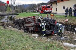 SANKT KONRAD (OÖ): Ein Traktorlenker kam am 6. April 2017 aus bisher unbekannter Ursache mit seinem Fahrzeug, samt mit Holz beladenem Anhänger, von der Straße ab und stürzte in die Laudach.