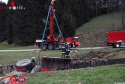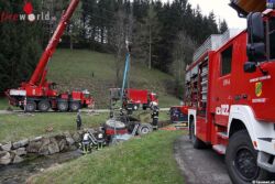Die Bergung des verunfallten Traktors aus der Laudach gestaltete sich schwierig. Zuerst musste das Holz abgeladen und eine 30kV-Stromleitung abgeschaltet werden, bevor das verunfallte Gespann mit einem Kranfahrzeug der Feuerwehr aus dem Bachbett der Laudach geborgen werden konnte.
