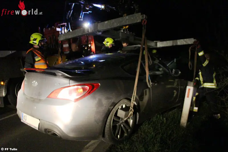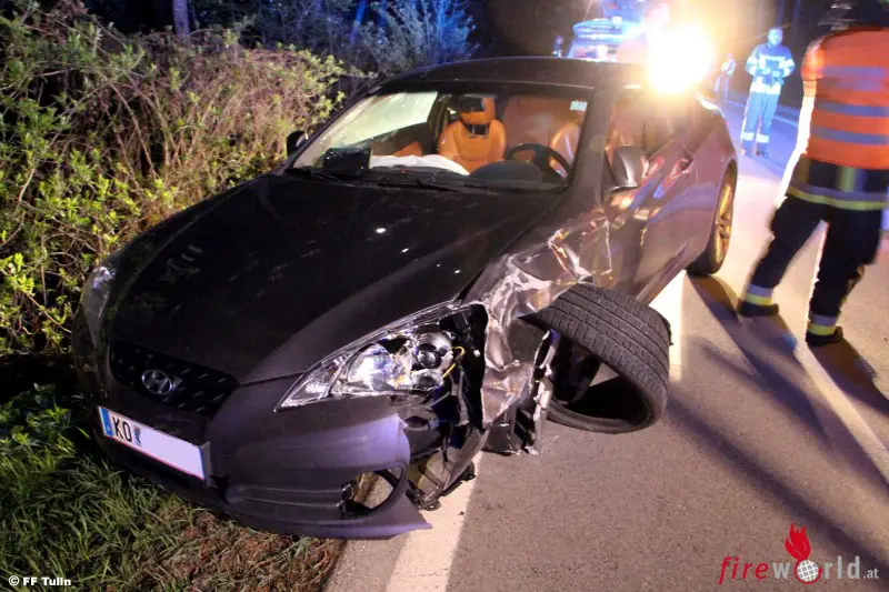 TULLN (NÖ): Am 09.04.2017 wurde die FF Tulln um 21:42 Uhr zu einem Verkehrsunfall auf der L2156 zwischen Tulln und Trübensee alarmiert. Der Lenker eines Hyundai Genesis Coupés war in Richtung Trübensee unterwegs, als ihm auf einem geraden Streckenabschnitt ein anderer Hyundai entgegenkam.