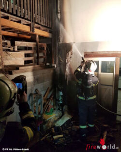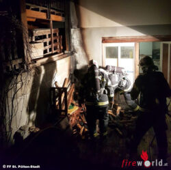 ST. PÖLTEN (NÖ): In der Nacht auf den 10. April 2017 kam es in einer Wohnsiedlung in St. Pölten zu einem gefährlichen Brandausbruch. Aus unbekannter Ursache fing ein Holzstoß im Bereich eines Kellereinganges Feuer. Dieses breitete sich schnell auf Fassade und die darüber gelegene Terrassenkonstruktion aus.