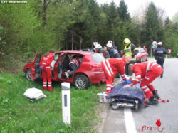 Wenige Minuten später folgten noch das Kleinrüst- sowie das Kommandofahrzeug. Nach dem Eintreffen wurde vom Einsatzleiter folgende Lage festgestellt: Ein Pkw war von der Fahrbahn abgekommen und mit einem Baum kollidiert. Drei verletzte Personen befanden sich noch im Fahrzeug. Diese wurden gemeinsam mit dem bereits anwesenden First Responder-Team unter Einsatz des Spin-Boards aus dem Fahrzeug gerettet.