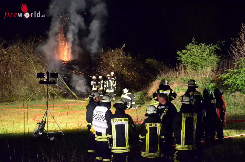 In der Nacht zum Samstag bemerkte eine Dame auf der späten Hundegassirunde gegen Mitternacht, dass das Ahldener Osterfeuer brannte. Beim Eintreffen der Feuerwehr stand der mittlere Bereich des kurz zuvor aufgeschichteten Osterfeuers in hellen Flammen. Problematisch war die Wasserversorgung am etwas abgelegenen Osterfeuerplatz. So forderte Ortsbrandmeister Mario Müller das Hodenhagener Tanklöschfahrzeug nach, um einen Pendelverkehr zwischen der nächsten Wasserentnahmestelle und dem Einsatzort einzurichten. Dank der Unterstützung von Ahldener und Hodenhagener Betrieben konnte mittels Radlader und Kran das eng aufgeschichtete Brennmaterial auseinandergezogen werden, um die eigentlichen Flammen zu löschen. Etwa 90 Minuten nach der Alarmierung konnte "Feuer aus" gemeldet werden.