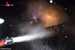 Ein Stallgebäude, in welchem Stiere untergebracht waren, stand unter Vollbrand. Unter Einsatz von schwerem Atemschutz wurde sofort mit den Löscharbeiten begonnen. Nachdem die mehrere hundert Meter lange Wasserzubringerleitung aufgebaut und damit die Löschwasserversorgung gesichert war, konnte mit umfassenden Löschangriffen begonnen werden. Von zwei Wasserstellen wurde mit Unterstützung von fünf Tragkraftspritzen Wasser über gesamt 1.200 Meter lange Schlauchleitungen zur Einsatzstelle gepumpt.