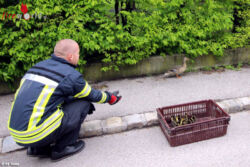 TULLN (NÖ): Am Donnerstag, dem 20.04.2017, wurde die Feuerwehr der Stadt Tulln um 11:07 Uhr zu einer Tierrettung in der Robert-Stolz-Straße alarmiert. Ein aufmerksamer Autofahrer meldete direkt bei der Feuerwehr, dass eine Entenmutter mit ihren elf Küken im Tullner Stadtgebiet unterwegs sei und die akute Gefahr bestünde, dass die Kleinen unter die Räder eines Autos kommen.