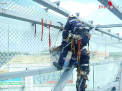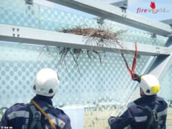 Da sich in unmittelbarer Nähe ein Hubschrauberlandeplatz befindet und der Hubschrauber eine Gefahr für Nest und Vogel darstellt bzw. umgekehrt, haben die Haustechniker die Feuerwehr verständigt. In Zusammenarbeit mit der Tierrettung wurde die Umsiedelung des Nestes mit fünf Eiern u Mittag des 21. April 2017 durchgeführt. Zwei Höhenretter stiegen gut gesichert zu dem Nest auf und hoben es