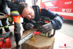 Highlight des Tages war dabei das Arbeiten am s.g. „Spannungssimulator“. Mit diesem Gerät können Baumstämme hydraulisch gebogen werden um Holz zu simulieren, welches durch Windbruch „kreuz und quer“ liegt. Ein realistisches und für die Feuerwehren durchaus nicht seltenes Szenario! In der abschließenden Feedbackrunde zogen die Teilnehmer ein rundum positives Resümee.
