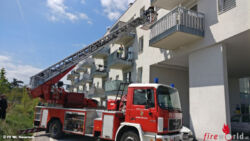 Kurz danach rückten unsere Drehleiter und unser Logistikfahrzeug aus. Vor Ort wurde die Frau am Balkon vorgefunden. Sie gab an, vom Sohn ausgesperrt worden zu sein. Alle Versuche, den Sohn zum Öffnen der Türe zu bewegen, scheiterten. Beim Eintreffen der Feuerwehr schlief der kleine Tadej (1 1/2 Jahre) seelenruhig im Wohnzimmer. Die Feuerwehrmänner stiegen daraufhin durch ein Fenster im zweiten Stock ein. Dazu wurde das bereits gekippte Fenster mittels Spezialwerkzeug geöffnet. Kurz darauf konnte die Mutter wieder in die Wohnung gelassen werden. Das Kind verschlief den ganzen Einsatz.