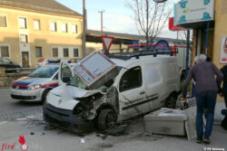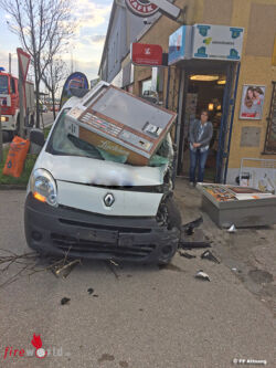 ATTNANG-PUCHHEIM (OÖ): Zu einem Verkehrsunfall auf der Bundesstraße 1 wurde die FF Attnang am Morgen des 25.April 2017 alarmiert. Ein aus Schwanenstadt kommender Pkw kam über die Gegenfahrbahn auf den Gehsteig und touchierte dort entlang der Mauer der Bahnhofstraße bis zur Trafik Hasenburger, wo er zwei Zigarettenautomaten aus der Verankerung riss.