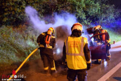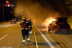 Bis zum Eintreffen der Feuerwehr wurde zwar noch mit tragbaren Feuerlöschern versucht, den Brand zu löschen, dies missglückte aber dem unverletzten Fahrer und couragierten Ersthelfern. Durch die Mannschaft des erstankommenden Hilfeleistungsfahrzeug wurde unverzüglich eine C- Löschleitung vorgenommen und der Brand unter Atemschutz gelöscht. Um auch die letzten Glutnester zu finden setzten die Feuerwehrmänner eine Wärmebildkamera ein, und demontierten auch Teile der Innenverkleidung. Zur Sicherheit der Einsatzkräfte wurde eine Airbag Rückhaltegurt im Fahrzeug angelegt und die ersten beiden Fahrspuren für den Verkehr gesperrt.