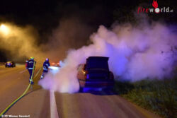 WIENER NEUDORF (NÖ): Aus bisher unbekannter Ursache geriet in den Abendstunden des 26. April 2017 ein VW Vento mit Tullner Kennzeichen auf der Südautobahn in Fahrtrichtung Graz Höhe Wiener Neudorf in Brand. Bei Ankunft der um 21:14 Uhr alarmierten Freiwilligen Feuerwehr Wiener Neudorf am Einsatzort stand bereits der Motorraum in Brand. Erste Flammen schlugen in das Fahrzeuginnere.
