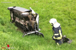 Die Lenkerin konnte sich selbst aus dem verunfallten Fahrzeug befreien und blieb unverletzt. Der VW Polo wurde nach Dokumentation des Unfalles durch die Polizei mittels Teleskoplader aus der Schräglage zurück auf die Straße gehoben und dem Pannendienst übergeben. Nach abschließenden Aufräumtätigkeiten konnte wieder eingerückt werden.