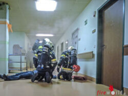 Realistischer Flammenschein flackerte und dichter Rauch quoll plötzlich aus einem Lagerraum im Bewohnertrakt des Hauses, die Brandmeldeanlage schlug sofort Alarm und rief zwei Pflegerinnen zum betroffenen Zimmer. „Diese erkannten sofort den Ernst der Lage und reagierten absolut vorbildlich“, so Übungsbeobachter und Trauns Feuerwehrkommandant Oskar Reitberger jun. „Sie schlossen die Türe zum Brandraum wieder und verhinderten dadurch eine Verrauchung des Ganges im Bewohnertrakt. In der Folge wählten sie den Notruf 122 und kümmerten sich sofort um die Evakuierung der angrenzenden Zimmer“.