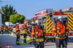 Nachdem die Einsatzkräfte der Freiwilligen Feuerwehr Dettenheim am Übungsobjekt eingetroffen waren, wurde die Lage durch den Einsatzleiter erkundet und ein Trupp ging unter Atemschutz zur Menschenrettung und Brandbekämpfung in das Firmengebäude vor.