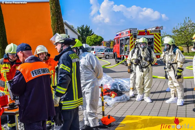 Nun kam auch der Inhaber des Firmengebäudes an das Übungsobjekt vor Ort. Er informierte den Einsatzleiter der Feuerwehr über das im Gebäude befindliche Gefahrgut. Dies bestätigte zudem der im Gebäude eingesetzte Atemschutztrupp. Aufgrund dieser Lage ließ der Einsatzleiter umgehend die Experten für Strahlenschutzeinsätze nachalarmieren. So wurden Kräfte der Freiwilligen Feuerwehr Philippsburg, der Freiwilligen Feuerwehr Malsch, der Werkfeuerwehr KIT, der Freiwilligen Feuerwehr Bruchsal, sowie Kräfte des ABC-Zuges Karlsruhe und ein Fachberater Strahlenschutz hinzugerufen.