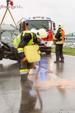 Nach der Abfahrt Krems-Ost waren in Fahrtrichtung Tulln auf Höhe der Firma Birngruber zwei Fahrzeuge kollidiert, ein Pkw wurde bei dem Zusammenstoß von der Fahrbahn und anschließend in einen Wildschutzzaun geschleudert.