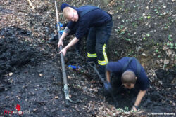 Noch nicht sicher, ob zu dem Einsatz auch noch ein Bagger hinzugerufen werden müsse, begaben sich die Feuerwehrleute im Wald in eine wahre Schlammschlacht: Mit Schaufeln und bloßen Händen gruben sie am Rohr befreiten dieses nach und nach vom Schlamm, der sich dort festgesetzt hatte. Mehrer Feuerwehrleute mussten sich wegen der Anstrengung mit der Befreiung abwechseln.