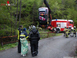 Die Bergung des verunfallten KFZ wurde mittels Kran des SRF Hartberg durchgeführt. Aufgrund des raschen Einsatzes der beiden Feuerwehren konnte der Zeitplan der Rallye gehalten und die Strecke um 20:00 Uhr wieder freigegeben werden.