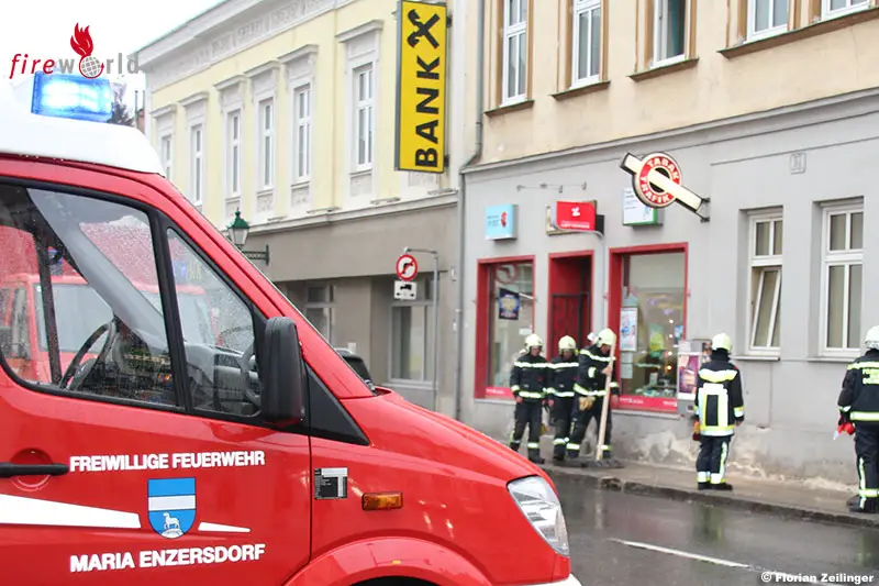 MARIA ENZERSDORF (NÖ): Vermutlich aufgrund Bauarbeiten im Gebäude stürzten am 3. Mai 2017 lose Fassadenteile auf den darunterliegenden, stark frequentierten Gehsteig in der Hauptstraße. Gegen 16:00 Uhr wurde die Freiwillige Feuerwehr Maria Enzersdorf alarmiert, um die nötigen Sicherungsmaßnahmen durchzuführen.