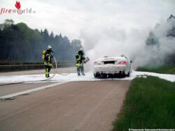 HANSTEDT (D): Ein Pkw-Brand beschäftigte am Morgen des 2. Mai 2017 die Feuerwehren aus Egestorf und Sahrendorf-Schätzendorf. Beim Eintreffen der Einsatzkräfte stand ein in Leichtbauweise gefertigtes Cabrio bereits in Vollbrand.