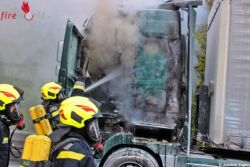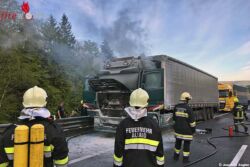 ALLAND (NÖ): Gegen 19 Uhr des 3. Mai 2017 war ein Sattelkraftfahrzeugzug, beladen mit Metallteilen, auf der A21 bei Hochstraß (im Bezirk Baden) unterwegs. Während der Fahrt nahm der Lenker plötzlich Brandgeruch war und hielt sein Gespann geistesgegenwärtig am Pannenstreifen an.
