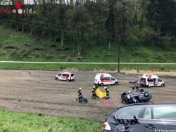 Dabei überschlug sich ein Fahrzeug mehrmals und kam auf einem Acker zu liegen, eine Person wurde eingeklemmt. Das zweite Fahrzeug blieb auf einem Hang neben der Bundesstraße liegen mit zwei eingeklemmten Personen, dieses drohte abzurutschen. Das dritte Fahrzeug wurde ebenfalls schwer beschädigt, der Insasse jedoch nur leicht verletzt.