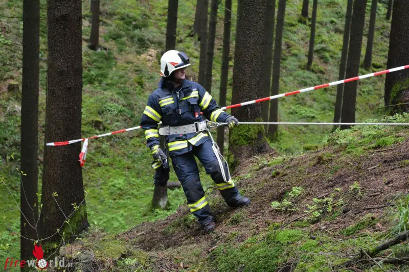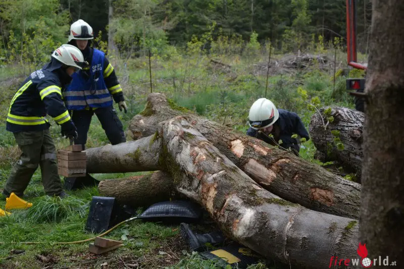 Alle freiwerdenden Kräfte waren angehalten sich bei der Einsatzleitung zu melden. Dort wurden sie in Gruppen eingeteilt und mussten einen Stationsbetrieb durchlaufen. An drei Übungsplätzen im Wald waren technische Übungsszenarien vorbereitet. Bei der ersten Station musste ein Verletzter unter einigen Baumstämmen befreit werden. Die zweite Aufgabe war, als Gruppe einen Holzstamm mit sechs Schnitten genau um einen Meter zu kürzen, natürlich ohne Maßband. Beim dritten Szenario ging es darum, einen Verletzten aus einer Schlucht zu retten. Mit Hausverstand, Geschick und den bereitgestellten Gerätschaften konnten alle teilnehmenden Gruppen die Aufgaben mit Bravour meistern.