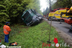 ST. JOHANN AM WALDE (OÖ): Ein Sattelzug kam am 8. Mai 2017 auf der Frauschereck Landesstraße L 1061 in Frauschereck von der Fahrbahn ab und kippt um, woraufhin die Feuerwehren Frauschereck und St. Johann am Walde von der Landeswarnzentrale alarmiert werden.