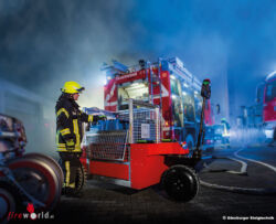 GÜNZBURG (DEUTSCHLAND): Revolution im Materialnachschub: Ab sofort können Rettungskräfte im Einmannbetrieb bis zu einer Tonne an Schaummittel, Geräten oder sonstigem Material von A nach B bringen – selbst in unwegsamem Gelände und über Hindernisse wie Bordsteinkanten oder Schläuche hinweg. Möglich macht es der neue vollelektrisch angetriebene Rollcontainer „eRC“ des bayerischen Qualitätsherstellers Günzburger Steigtechnik.