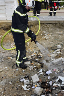 Bei Ankunft der Feuerwehr am nahen Einsatzort, musste das aus dem Fenster geworfene Brandgut mit einer Löschleitung abgelöscht werden. Parallel dazu wurden mehrere Hochleistungslüfter (Benzin und Elektroantrieb) vor und im Gebäude in Stellung gebracht, um für einen raschen Abzug der giftigen Brandgase zu sorgen.