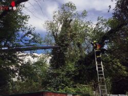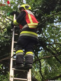 Auf Grund der ungünstigen Lage des Baumes, der sich auch in einem anderen verfangen hatte, und der Gefahr, dass er das Mobilheim beschädigt, musste äußerst behutsam vorgegangen werden. Der Baum wurde mit dem Kran gesichert und während des Schneidevorganges von den Feuerwehrkameraden mittels zweier Arbeitsleinen zu einer neben dem Campingplatz befindlichen Wiese gezogen.