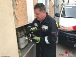 WAIDHOFEN / THAYA (NÖ): Am Montagvormittag, 15. Mai 2017, meldete ein Bewohner aus der Wiener Straße bei der Stadtgemeinde Waidhofen/Thaya, dass seine Katze rund 10 Meter vom Dach in die Tiefe gestürzt sei und nun in einem Zwischenraum zwischen zwei Wohnhäusern gefangen sei.
