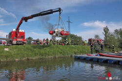 Da durch den Verkehrsunfall keine Möglichkeit zum Wassern der Motorboote bestand, wurde ein Schlauchboot mittels Kran ins Wasser gehoben. Das A-Boot musste in Aschach an der Donau zu Wasser gebracht werden. Die Löscharbeiten wurden mit insgesamt zwei Tanklöschfahrzeugen und vier Tragkraftspritzen durchgeführt – eine davon kam auf dem Boot zum Einsatz, da die Brandherde teilweise nur über das Wasser zugänglich waren.