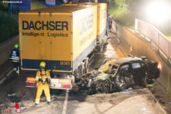 Aus bisher unbekannter Ursache kollidierte ein Auto mit hoher Geschwindigkeit mit einem LKW. Der junge PKW-Lenker wurde bei dem schweren Crash im Fahrzeug eingeklemmt.